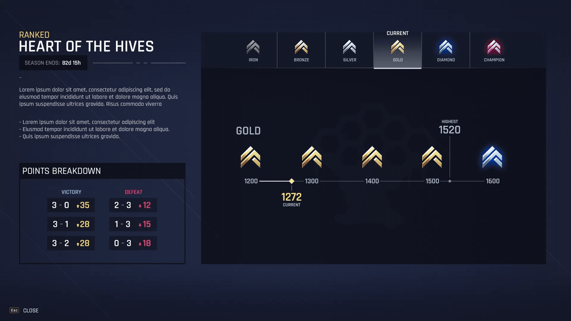 - Placement & Division Rewards: Animated the transition between skill tiers (e.g., Gold to Diamond), using progressive meters and bold iconography to celebrate player advancement.